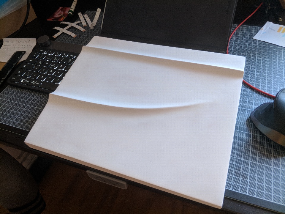 The edge fades out fairly quickly towards the bottom fillet and fades out slowly towards the top (can be a but further up than in the sketch). On the white model it's the bottom edge I want to use, just straight instead of curved up.