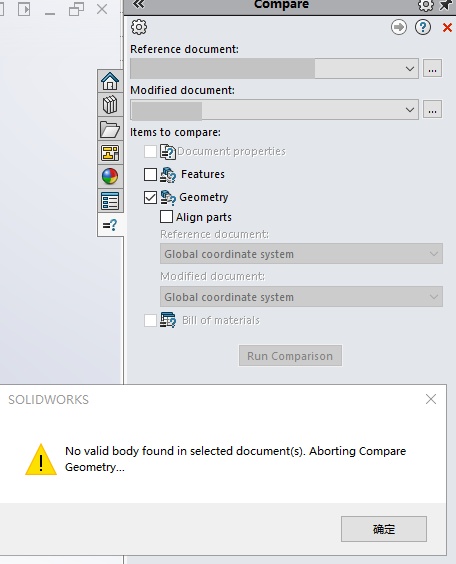 I tried, but failed. The error message shows:"No valid body found in selected document(s). Aborting Compare Geometry..."