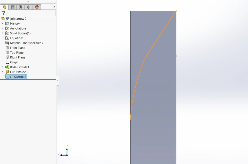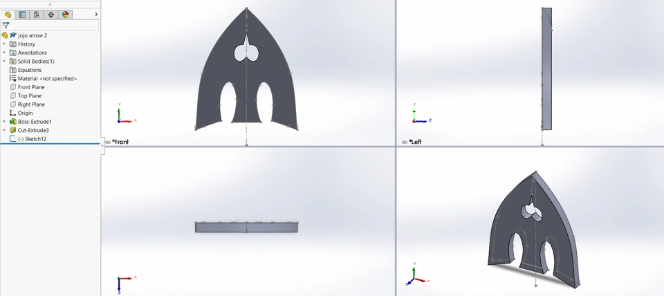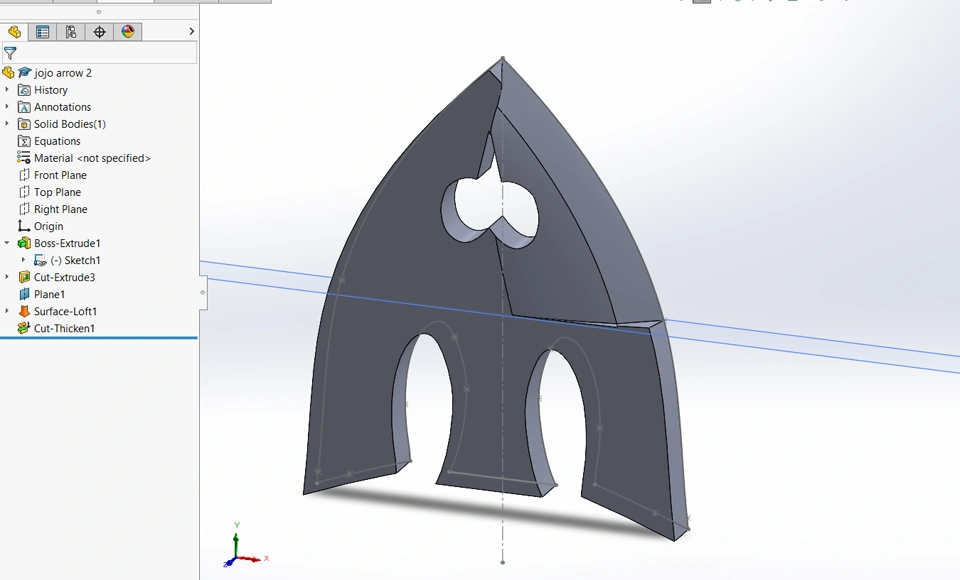 I'm a student working on this as a project for fun, but I can't wrap my head around this. I'm trying to match the shape of this arrowhead from a series I used to read, and I've tried using swept cuts, lofted surfaces, etc, but I couldn't figure it out. I'm just wondering how I can use this sketch to cut along the contour of the arrow, ideally without needing to make a new sketch on every corner. This is just one half of the arrowhead, as I plan on mirroring it afterwards.