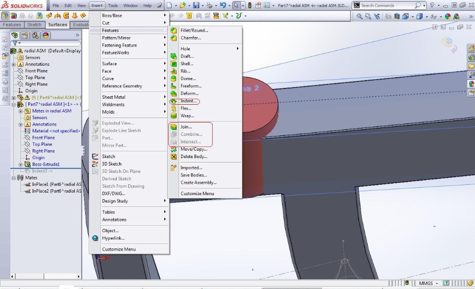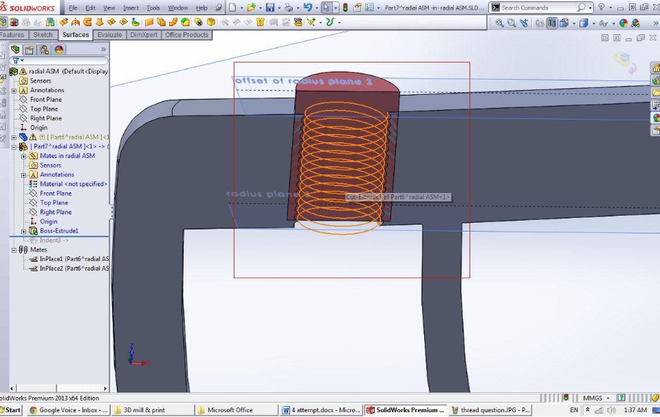I tried to use different tools to make a cutout on a part with outer threads by the use of a part with inner threads. (Nut "cuts out" threads on a bolt.)