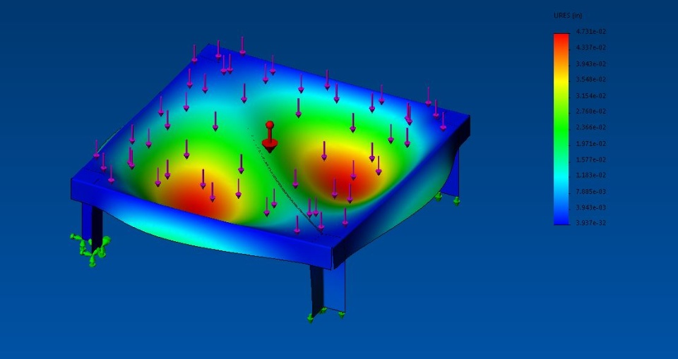 However, if I look at the displacement, the results look unexpected. "Large" (.05") bulges appear in the table top. It's the kind of displacement I would expect in a pressure situation rather than having a semi rigid load placed on top. Of course the wooden or plastic container itself would deform under load, but I don't see it following the displacement pattern show.