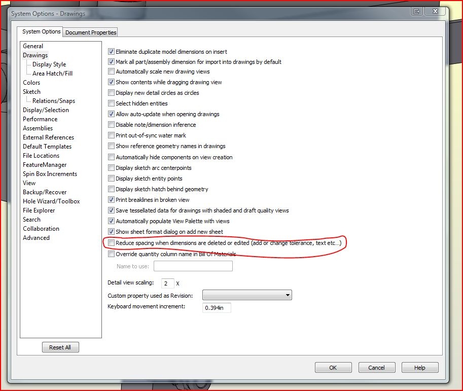 I know this is because of the new "rapid dimension" function but I swear I read there was a place to turn off the dimensions adjusting automatically. What I remember reading was to set the dimension offset distance to 500 and uncheck some box under document properties-dimensions that would prevent the dims for adjusting. I cant seem to find this box. Am I dreaming?