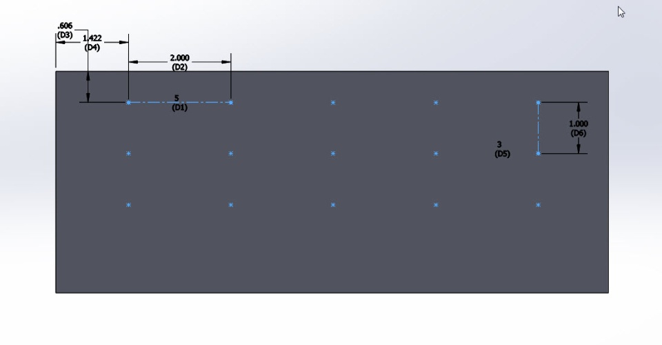 I have a sketch that’s patterning the upper left point over 5 times to the right. Then I pattern that original hole and pattern down 3 instances.