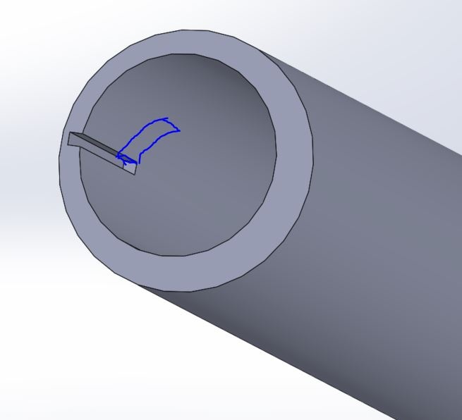 I am trying to connect some 3d printed components without the use of glue, adhesive, or snap fit joints. I want to use a quarter turn that will lock the two pieces together. I have a cylinder and am trying to create a cut out path on the inside of the cylinder to have a path for the other joint to connect to. I am attaching an image of the cylinder. I want to create a cut where the blue marking shows. How do I go about this? I tried using the revolved cut but am unable to select an access of rotation to cut around.