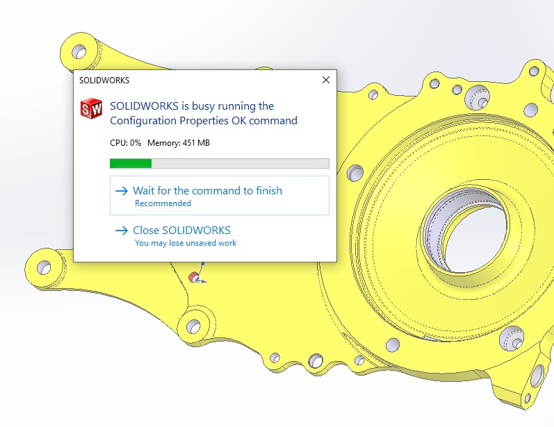 In "Configurations", "Properties" then "Custom Propertires" I'll make a change then click "OK" followed by clicking on the Green Check Mark.....The software hangs for a minute or two. Why?