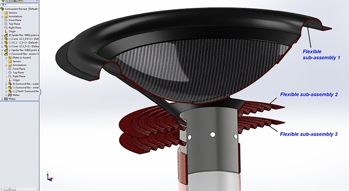 I have a model of a speaker. I would like to simulate its movement for a rendered animation. So far I have been able to make the parts flex the way I want within their own small assembly. When I put the flexible sub assemblies(set to flexible) into the larger assembly shown below, the flexible parts don't update.