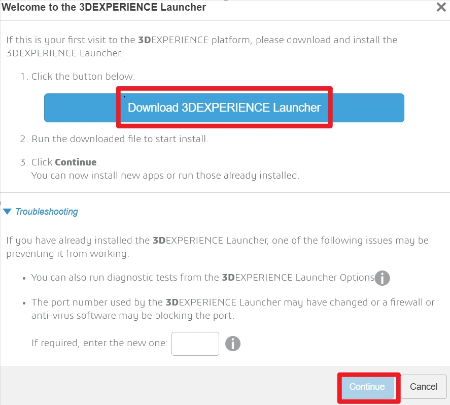 I tried to install the Design with Solidworks. After I clicked the install button, a window popped up as shown in below pictures. I clicked on the download button. It was supposed an installation should be run automatically, but actually it didn't. I had to install the 3DEXPERIENCE Launcher from the File Explorer. When the installing was finished, I clicked the button Continue, but nothing happened. It was supposed to open another window and continue the installation process of Design with Solidworks.