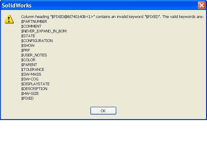 Does anybody know why I get an "invalid keyword \\\$FIXED"message when I open a design table? The design table was createdautomatically so the parameter was created by Solidworks ratherthan me entering it in excel & when I get the error message itgives me a list of valisd keywords which include \\\$FIXED!!SolidworksConfigurations design Tables