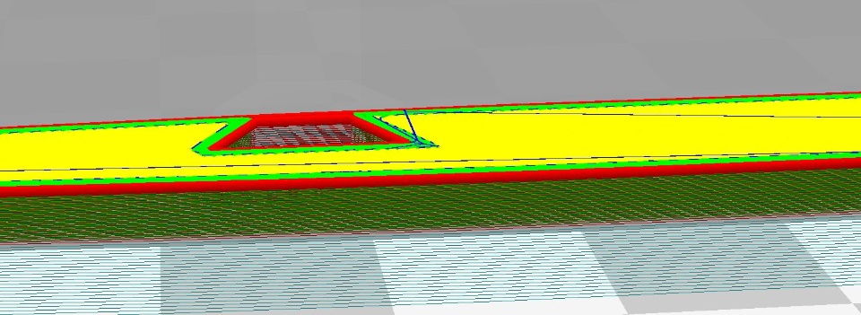 I have been having a lot of trouble with a fin I am trying to model. Initially, the issues came from surfacing a 3 sided boundary (this is why I use the 3D sketches and it looks a little messy at times). Once it had been surfaced, I extruded to surface and mirrored body around midplane. I then had issues trying to make the holes at the bottom where they would go through the mirrored part but NOT through the surface. To get around this, I trimmed the surface in the shape of the hole. Now, the part looks exactly how I want it and it seems complete but it will only print half of the hole! I have attached the STl and the SW part as well as screenshots of cura trying to slice the piece. While it is clear there is an empty space on the part, it prints half filled in. Any ideas on how to fix this? Thank You!