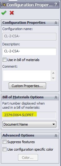 In the Configuration Property manager in a part or assembly, there is a part number under Bill of Materials Options. The value can be the Configuration Name, Document name or a User Specified name.