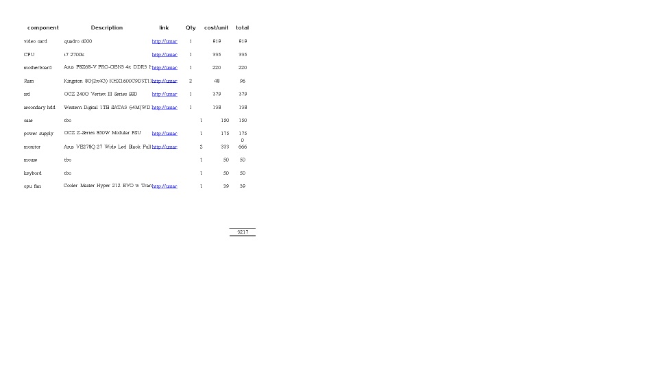 i'm in the market for a new cad pc for work and i've whipped up a quick spread sheet of the components that i want to get, have a look and let me know what you guys think.