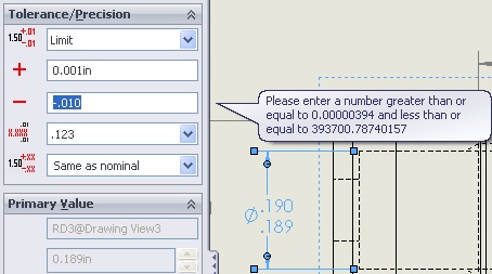 He can correct the value of the positive tolerance. When he editsthe negative tolerance of the limit tolerance, it gives an error.It basically shows his negative tolerance as a positive tolerance(it has a + symbol before the tolerance), and prompts to "enter ina number greater than .00000394 and less than 393700.---).
