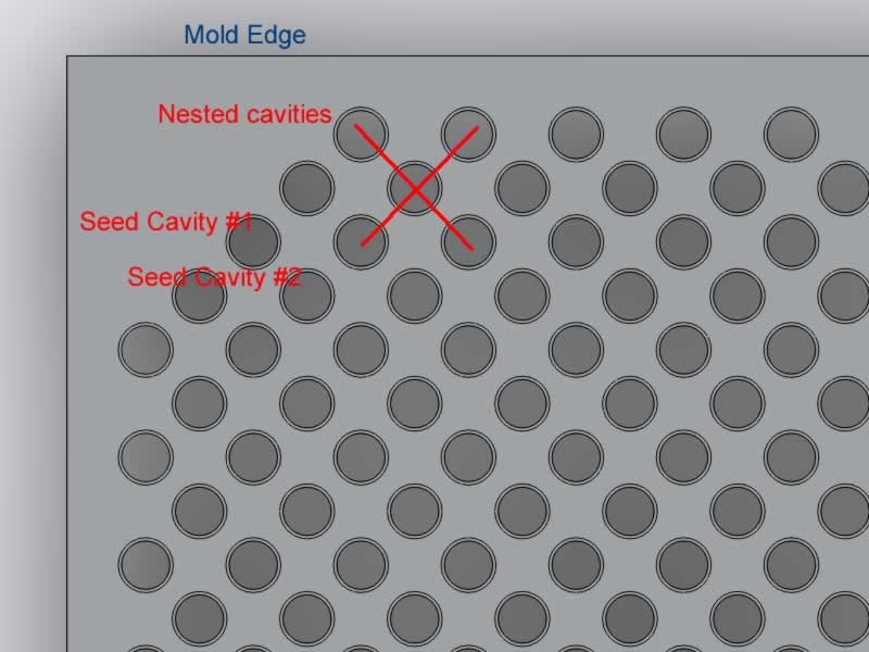 I am trying to place as many features (mold cavities, ~.25" is the max diameter of the cavity) into a 15" X 15" plate. The seed cavity is composed of 6 extruded cuts. I can easily populate the plate with cavities with the linear pattern repeat feature. However, in order to populate the plate with the most number of cavities, I need to nest the cavities (see attached).