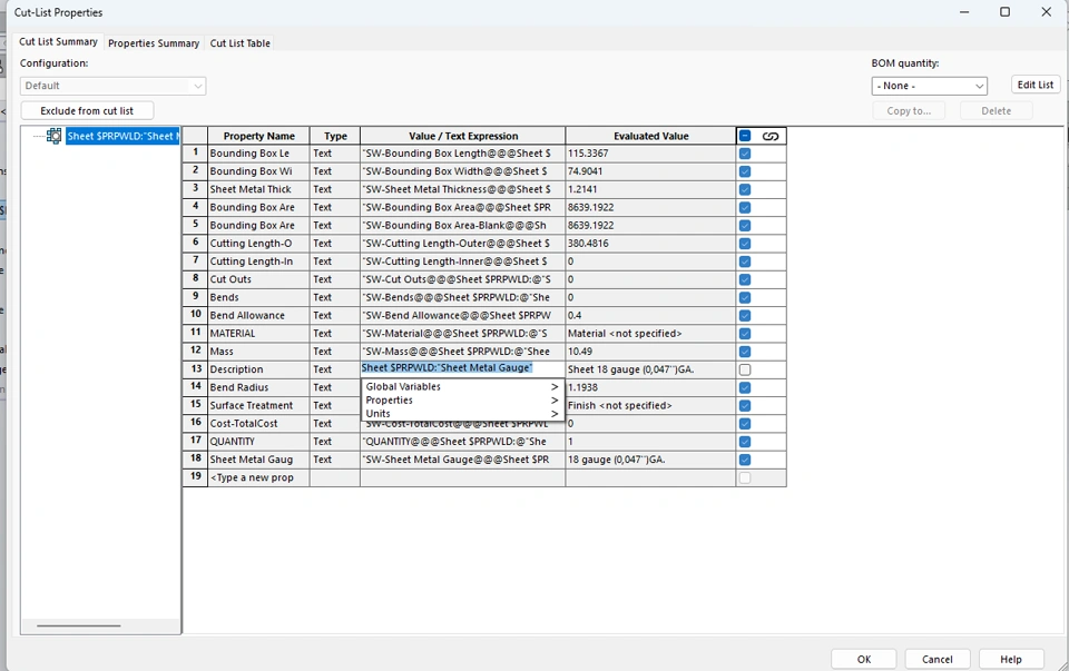 I am trying to Link the gauge property to The weldment body description, then when I generate my weldment cut list, the Gauge of the sheet metal is already in the description, but I have faced a small Issue.