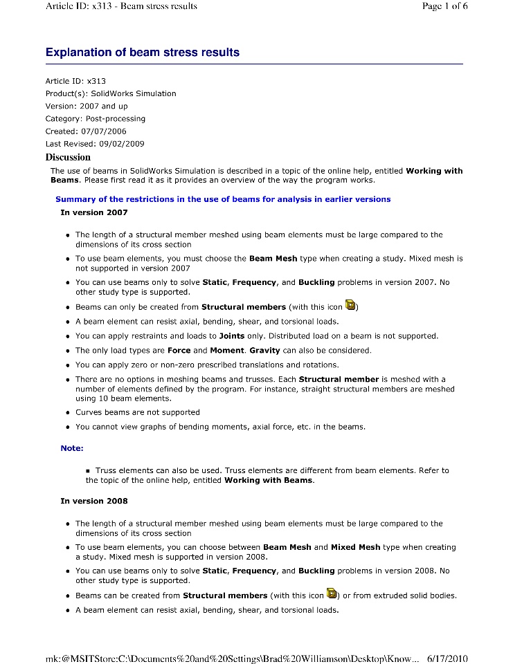 I am doing a frame and have been very glad in general for the beam simulation funtionality. One thing I would like to do is use the results for detailed analysis. In other words I want to take the loads transfered through an individual beam and apply them to a small detailed model of that beam. There are two things that are getting in my way as I try to do this. First the "Shear 1" and "Shear 2" forces seem to be applied to arbitrary planes with no relationship to the orientation of the loads applied to the beam. This is a little frustrating because I am always questioning weither "Shear 1" is in the X or Y direction when I am doing analysis, is there some sor of documentation from SW explaining the this "feature"?