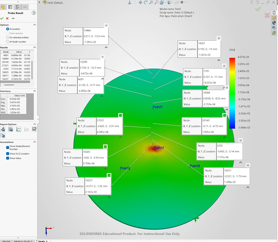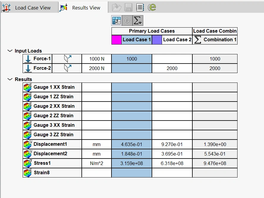 I am trying to use the Load Case Manager to apply varying forces to my model and monitor the displacement and orthogonal surface strain at various reference points, representing crossed strain gauges. Deformation and stress gives results, but every strain measurement is blank.