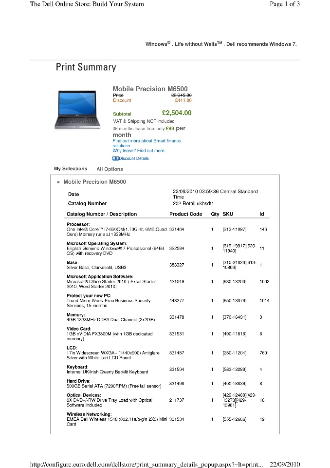 Precision M6500 : Silver Base, Clarksfield, USB3 1 S Processor Clarksfield, Memory runs at 1333MHz : One Intel Core i7- 820QM(1.73GHz,8MB,Quad Core) 1 S Display : 17in Silver Widescreen WUXGA (1920X1200) Antiglare with White LED LCD Panel 1 S Palmrest : No Contactless Smart Card 1 S Palmrest : No Fingerprint Reader 1 S Save 250 EUR on order above 2500 EUR 1 S Camera : Integrated 3.2 Mega Pixel Camera with Microphone for Silver Base 1 S Camera : Software for Integrated Camera (Only for standard Base ) 1 S LCD Back Cover : Silver with White LED 1 S Documentation : English Shipping Docs 1 S Resource DVD : Mobile Precision M6500 Diagnostics and Drivers 1 S Ship Accessory : English Set-Up and Features Docs for Graphic cards 1 S Memory : 8GB(2x4GB)1333MHz DDR3 Dual Channel 1 S Hard Drive : 320GB Serial ATA (7200RPM) (Free Fall Sensor) 1 S Raid Controller : All SATA Hard Drives, NON-RAID for 1 Hard Drive 1 S Windows Live 1 S Optical Drive : 8X DVD+/-RW Drive Tray Load no software 1 S Optical Drive : PowerDVD 8.3 Software 1 S Optical Drive : Roxio Creator 10.3 Software 1 S Power Supply+Power Cord : UK/Irish 210W Slim AC Adapter with UK/Irish Power Cord 1 S Battery : Primary 9-cell 90W/HR for Silver LCD Panel 1 S Carry Case : Not Included 1 S Graphics : 1 GB GDDR5 for ATI FirePro M7820 (with 1GB dedicated memory) 1 S Wireless : Dell Wireless 365 Bluetooth 1 S Wireless : EMEA Dell Wireless 1510 (802.11 a/b/g/n 2X3) Mini Card 1 S Keyboard : Internal UK/Irish Qwerty Backlit Keyboard 1 S Software Driver : Mobile Precision M6500 1 S Operating System : English Genuine Windows 7 Professional (64Bit OS) 1 S OS Media : MUI Windows 7 Professional (64Bit OS) Resource DVD 1 S Software : Microsoft Office Starter 2010 ( Excel Starter 2010, Word Starter 2010) 1 S Operating System Recovery Dell Backup and Recovery Manager for Windows 7 1 S AntiVirus : Trend Micro Worry Free Business Service (15 Month)Software MUI (AR,CZ,DK,NL,UK,HE,FR,DE,GR,IT,NO,PL,SE,RU,ES,TR) 1 S Precision Order - Ireland 1 S Base Warranty 1 S 3Yr Basic Warranty - Next Business Day - Minimum Warranty 1 S No Warranty Upgrade 1 S Declined CompleteCare 1 S VAT Summary Type VAT Rate EUR Net EUR VAT S 21 2,314.00 485.94 EUR Sub-total 2,289.00 Freight 25.00 VAT 485.94 Total 2,799.94 thanks, Declan.