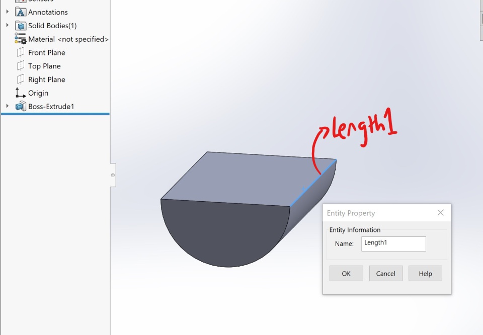 Hi everyone, I am planning to do a macro code for calculating length of an edge of a semi-circular model but I am not sure how to do it. Do help me out on this. I have attached the semi-circular workpiece model. The screenshot of the mode is shown below. I have labelled the edge that I want to calculate as "Length1" under "Edge properties". Appreciate with all the help I can get