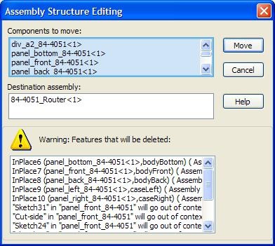 Which creates a new assembly. However, a dialog box pops up labeled "Assembly Structure Editing" asking the user if it is OK to Move the parts, breaking mates and equations in the process. If I don't select the Move button, it will not send the parts to the new external assembly. Is there a way to programmatically select the Move button on the Move Component PropertyManager?