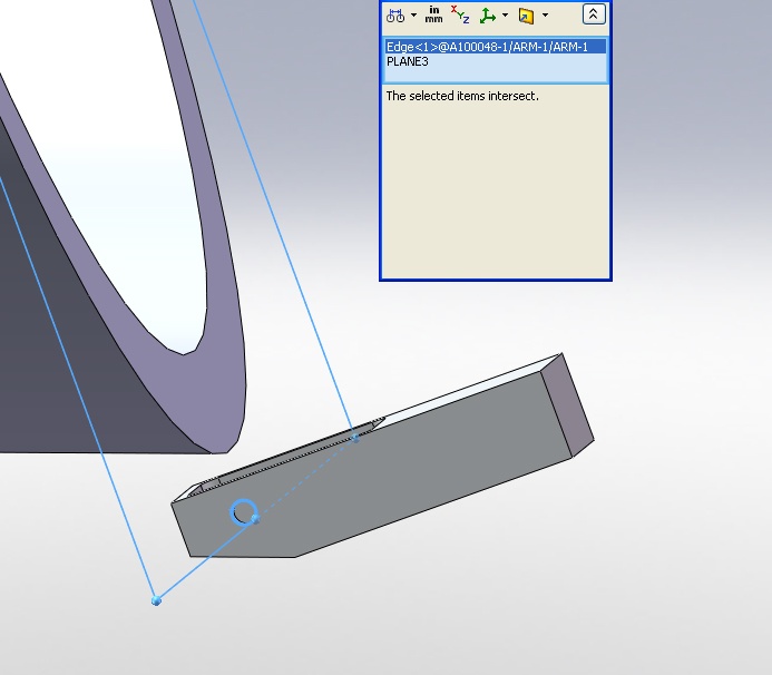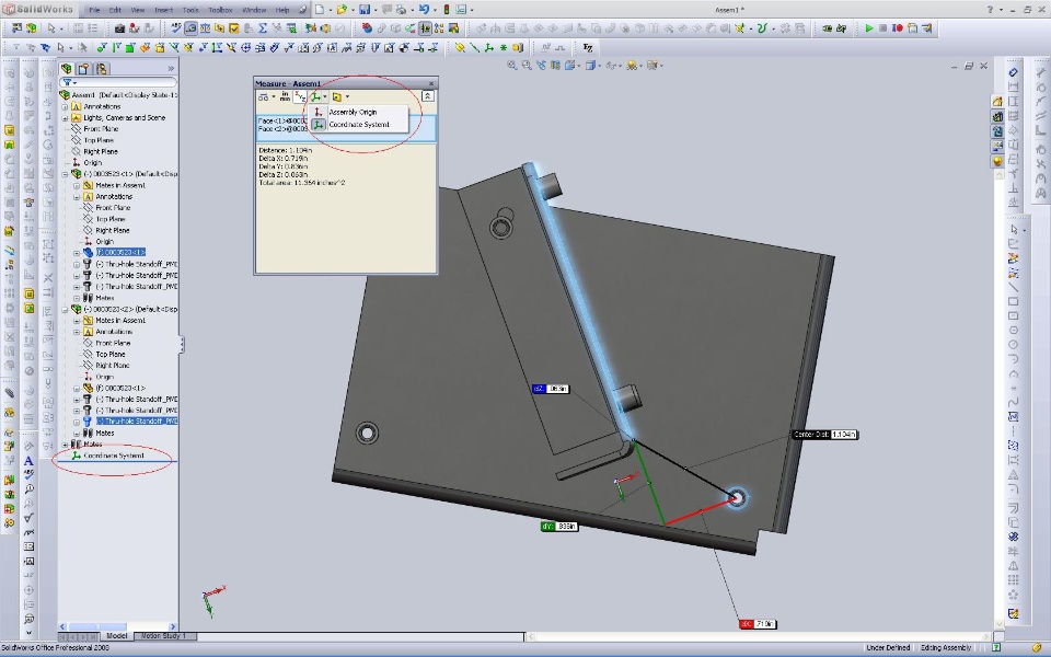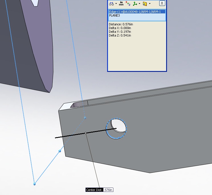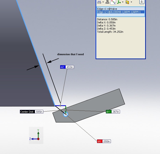 I'm having trouble measuring from a surface of one part to ahole in another part. I need the distance perpendicular to the faceto the hole. I tried it with SP 2.1 and SP 3.0. The face is notlined up to the XYZ coordinates as you can see in the picture.