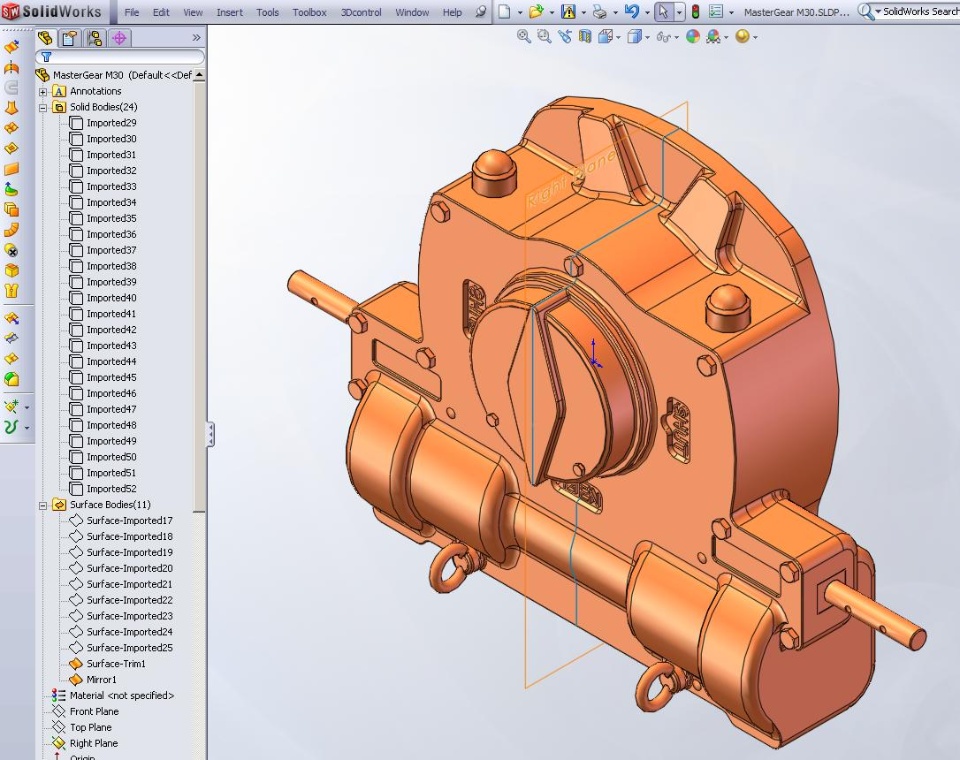 I need the version of the part that shows the whole part being mirrored by the right plane. So, by using the current front view, the shaft sticks out to the right. I need the part that shows the whole part mirrored with the shaft sticking out to the left. Could I get some help doing this please
