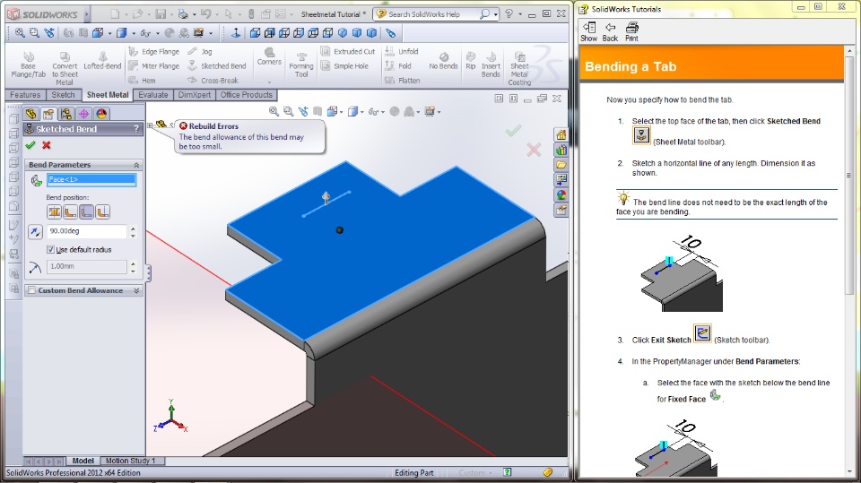 So im trying to learn some sheetmetal solidworks and Ive gotten stuck on "Bending a Tab" step. Using the Sketched Bend tool Ive followed the directions with the Bend Parameters, but i get the Rebuild error "The bend allowence of this bend may be too small". I thought this misht be due to the previous step "Adding a Tab", and how well defined the rectangle sketch was, but to no avail, see picture below for error. I've attached the file and am going to reboot and see if that helps.