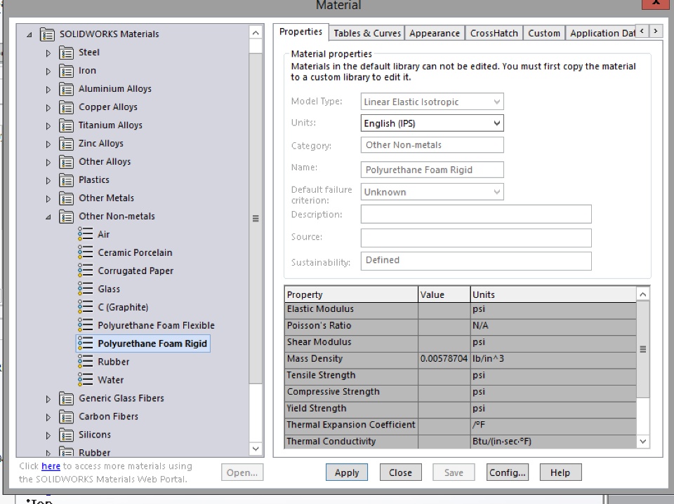 I am trying to do a deformation simulation on a polyurethane foam disk. However when I go to "run" my study, it says that I need to add elastic modulus in material properties. For some reason solid works does not have this value added in the properties (it only has density!) (see pic)