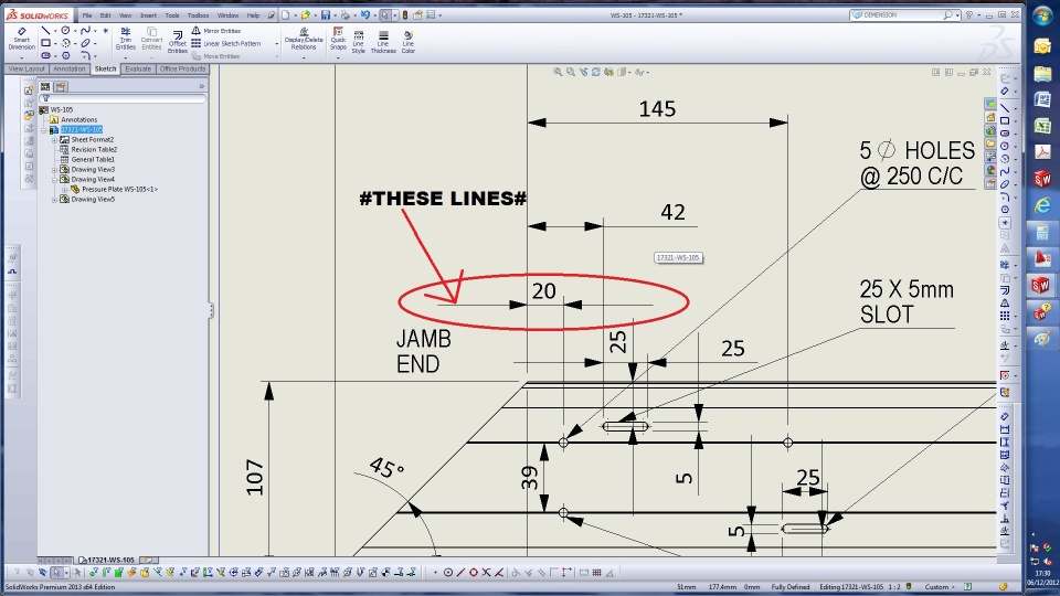 I am producing a detailed drawing and my dimension size 20 has to be an outside dimension, but the lines attached too it, are too long, and i cannot use an inside dimension as this clashes (see below in pic 1).