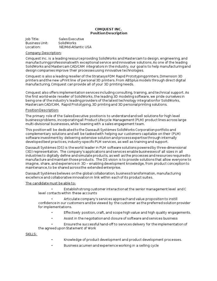 The primary role of the Sales Executive position is to understand and sell solutions for high level business problems, incorporating all Product Lifecycle Management (PLM) product lines across large multi-divisional businesses, while teaming with a sales engagement team.