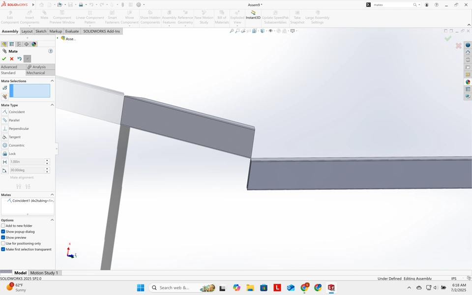 I have been trying to mate these two parts in an assembly, and when I select the two surfaces, they are always offset some way. I made sure that when I was working on each of these in part mode that the lines I drew when mitering them at 45° that the lines were black not blue. No matter what I do, the two parts are always offset.
