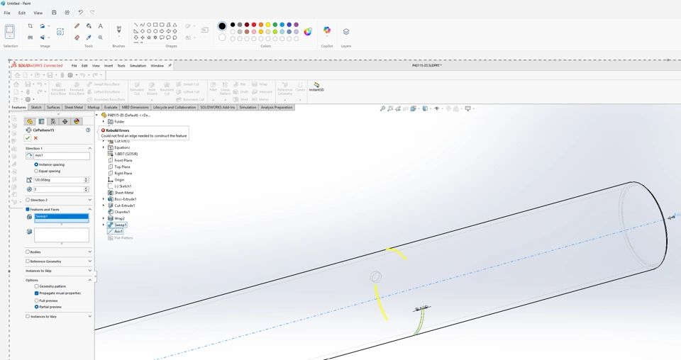 I have a problem with patterning sweep feature on rounded surface of the pipe. Somehow it shows the places where the feature will be patterned, but unfortunately it does not.