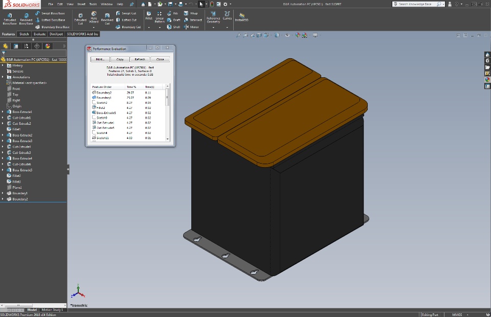 Fast model rebuilds in .38 seconds, and fully half of that is the two boundary features that serve no purpose beyond looking nice. The full model reports rebuilding in .19. Half the god damn time. For a model 100x the file size, with infinitely more features and details, and more everything. There's no way the full model "performs" better than my fast model, and yet that's what performance evaluation is reporting. All I can guess is that performance eval is being thrown off by the imported features instead of actually building the thing, but if that's the case then performance eval is useless. Are they any settings I can change to actually evaluate the real performance of the two models? Geometry or feature evaluations or something?