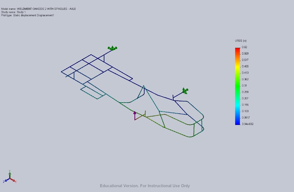So I fixed the end of the left side rear axle and the left side front spindle end. Then applied a 100lb load perpendicular to the top plane. The displacement on the end of the spindle was recorded. I repeated a study on the rear axle right side end and found the displacement there. This was done to both known chassis.