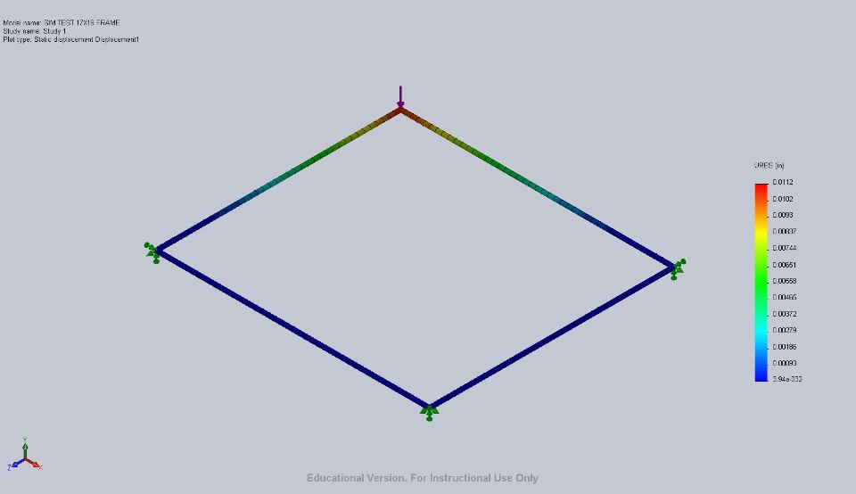I have two known chassis. Both have known handling characteristics. I modeled both chassis with 3D sketches and using Weldments with the correct tube profiles. My thought was to apply a 100lb load on the front corner of each known chassis and find the displacement. To keep things simple, the connections of the rear axle and front spindles to the frame, I used another tube of heavier wall. The idea is to focus only on how the chassis flexes under load.