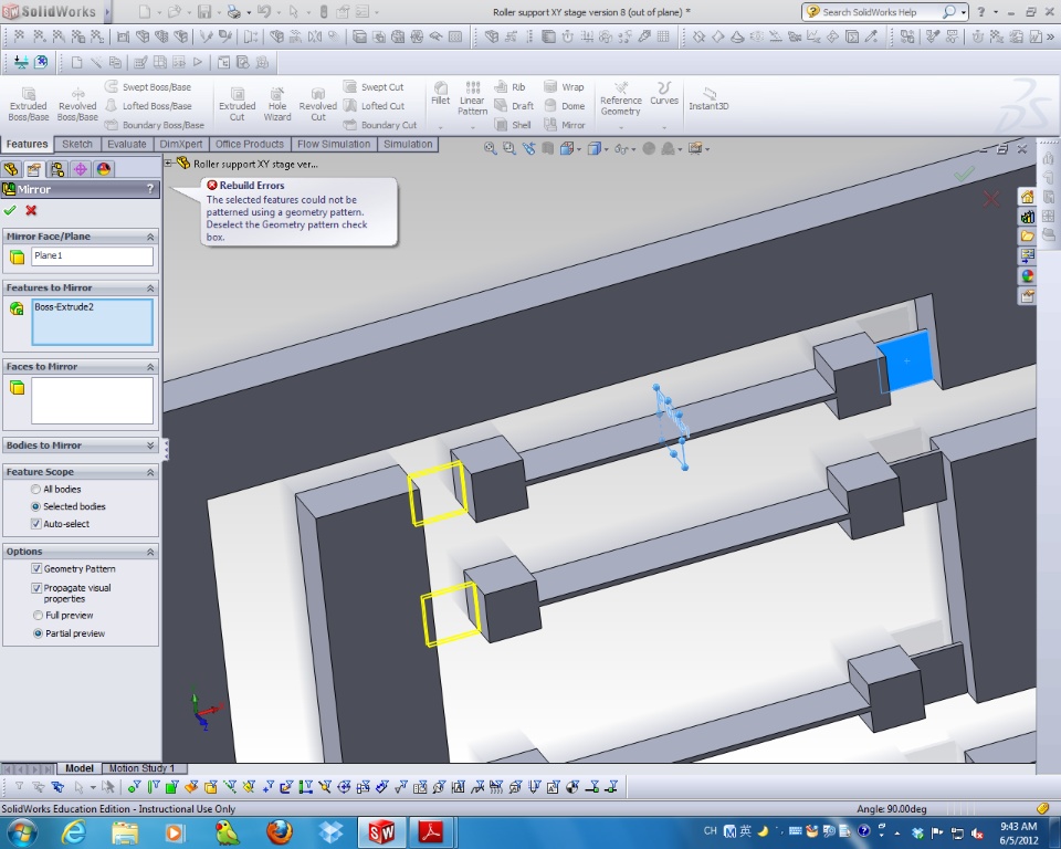 I want to mirror the feature in the right to the left through the reference plane, just like the situation in Figure 1. But it says I can not use a geometry pattern. So I clear the Geometry pattern option but then there is another problem saying invalid feature. What is wrong with it?