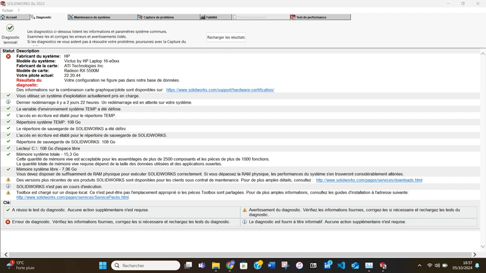 PS : The report is in FRENCH but it says that my computer configuration isn't known by Solydwoks.