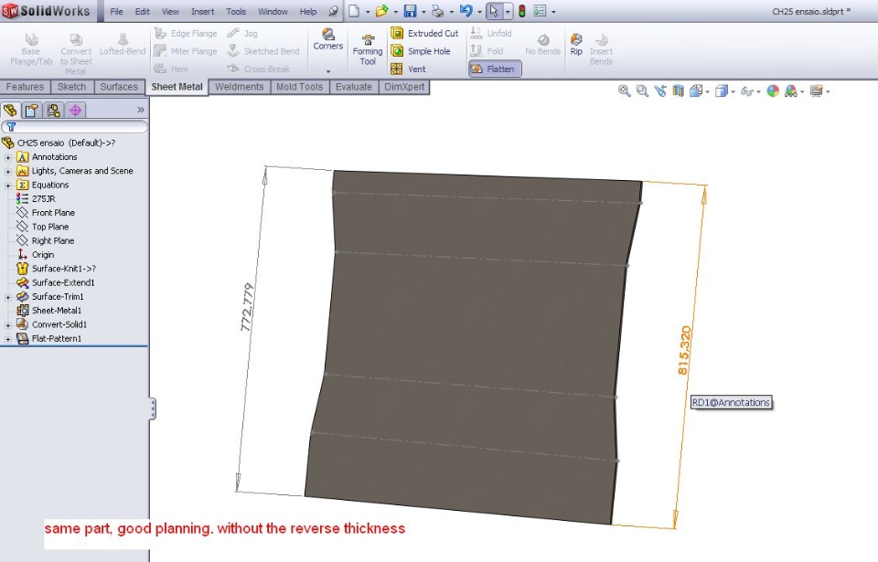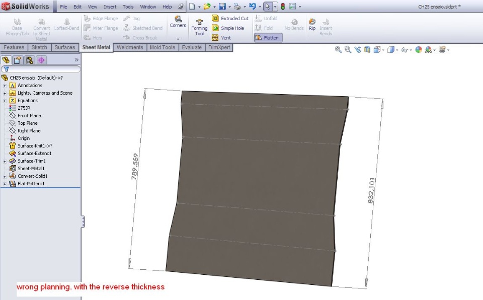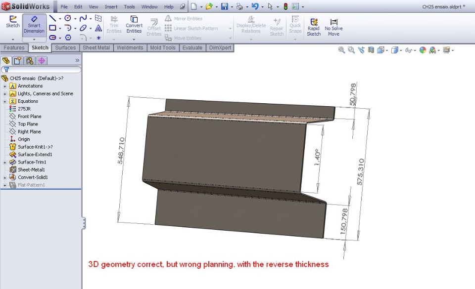 quando crio uma superficie com 6 faces usando loft para efeito cónico, ou seja, uma superficie tipo omega cónico, dependendo do lado para que quero a espessura da chapa. Dá valor errado no planificado.