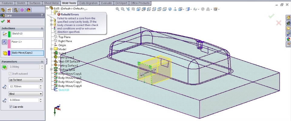 i had the following message while i was trying to create a core using a sketch.."Failed to extract a core from the specified cor cavity body. If the body choosen is correct then check end conditions and/or extrusion direction specified." I am not able to figure out the problem. Kindly help me with this.