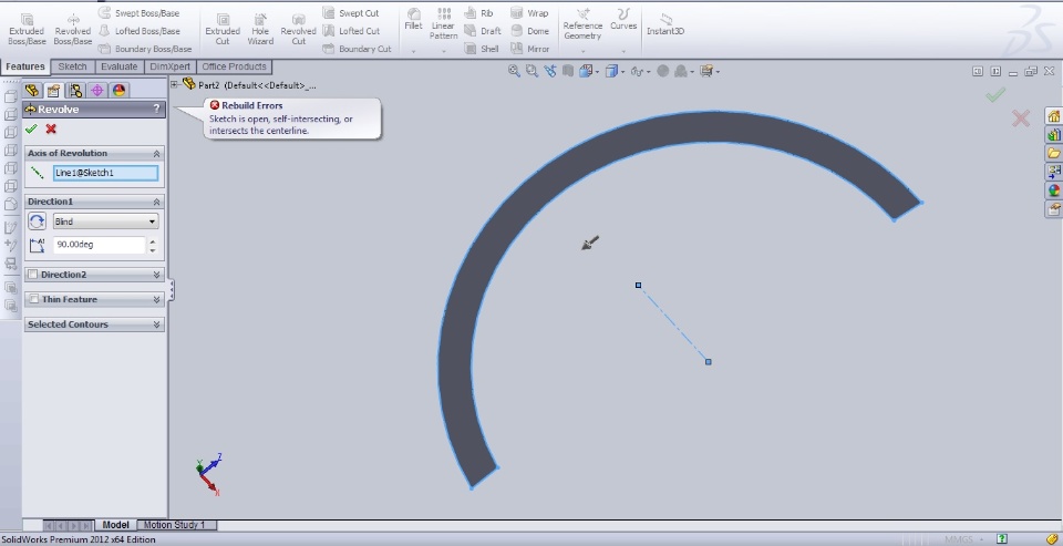 I want to make a solid hemisphere. I found the way to do it by making to hemicycles and drawing two lines joining them (as seen on the picture). Then, when I revolved the sketch by 180 degrees I realised the hemisphere to be hollow!! I then tried to find a way to make it solid. I went back to the 2-D sketch and filled the surface (Insert->Surface->Fill) inside the hemisphere. I saw some lines (which I don't know exactly why they appeared inside the surface) and I noticed that the hemicircle had become more of polygon (not an exact circle). I was OK with that since the difference was not that visible when I zoomed out, but then I had a problem revolving the sketch. I want to revolve it around a centerline but you can see on the picture the error that pops out. Any help and explanations on the above matter would be much appreciated!!! (as I have to fill many parts now that I realised that they are all hollow!!!)