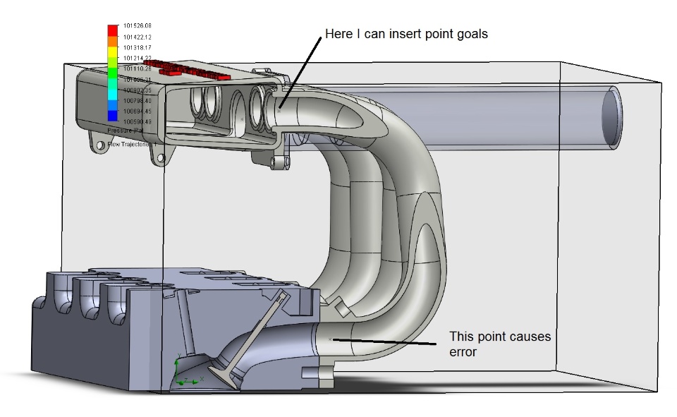 Hello, I'm making a flow simulation of intake manifold of car, it contains few parts (throttle, intake manifold and cylinder head). When I try to add point goal in channel of manifold, which is in computational domain, I received a error "Point is out of valid region.". When I add it in the channel of cylinder head (few milimeters further) there is no error. I can also add a points goals in upper part of intake manifold with no error. What causes this kind of error?