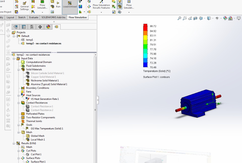 My issue deals with 'verification'. I want to see if Flow Simulation is at least 'ball park'. I've run the model several times using different mesh refinements, different materials, with and without contact resistances, etc. In all cases my max temperature is 73C +/- 3C on the heat sink. In the lab I applied exactly 1 watt to the resistor and waited for steady state. Then I used a very good (and well calibrated) thermal camera to measure the max temp of the heatsink...which was 53C. As you can see my results aren't even close.