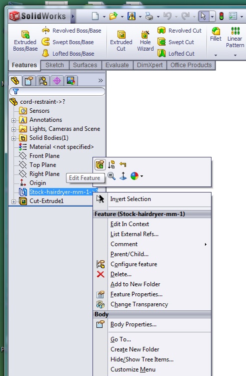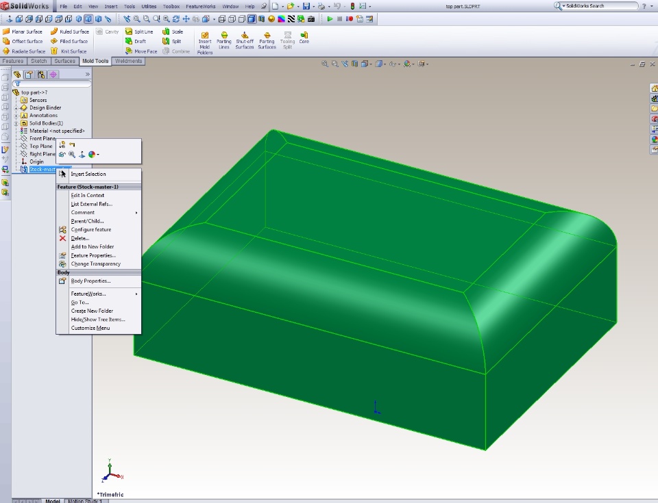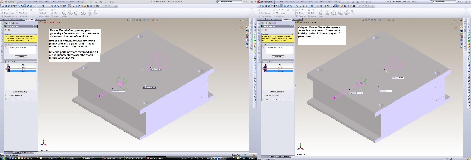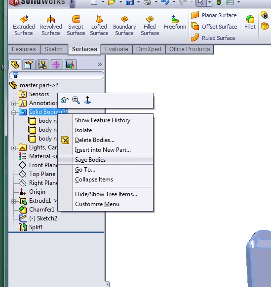 OK, so I'm making a mold. I create a part, then split it intoseparate parts, then create an assembly out of the split parts toadd holes, dowels, etc.