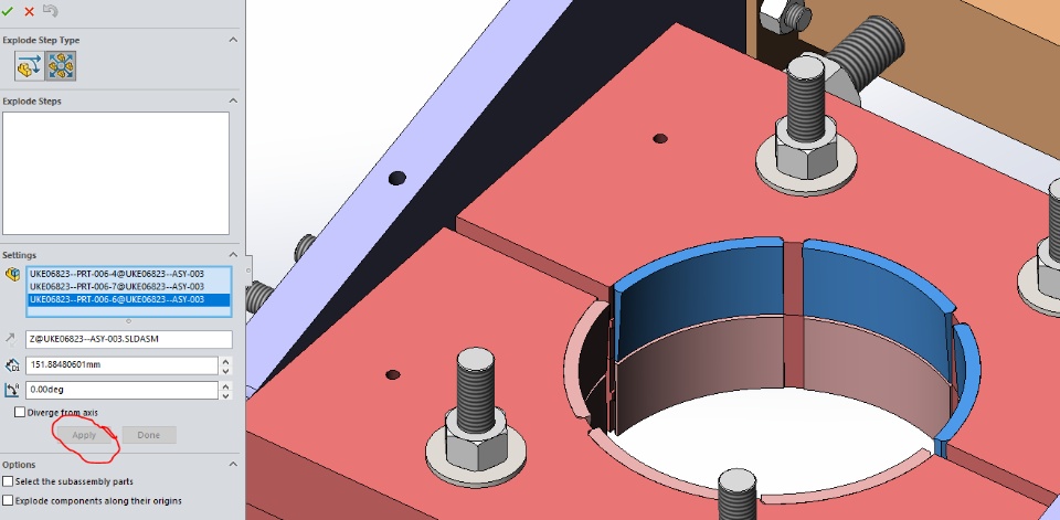 Solidworks 2018: I am trying to radially explode some components that are placed around a cylinder but it won't give me the option to explode them when i select them, if I try to force the correct explode axis by selecting the cylinder it just deselects my components. I can select certain other components in the assembly with this forced axis and they will explode fine though, or I can select an axis through one of those other components and the components i want to explode with explode about that axis, but this isn't the one i want... any thoughts?