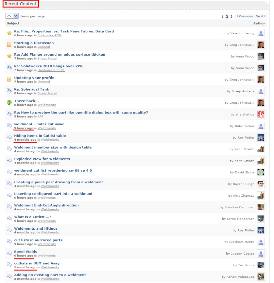 Is it just me, or are the Recent Content pages messed up? After the first page, it starts jumping from 9 hours ago, to 4 months ago. By page 4, I'm seeing stuff from a year ago, mixed with stuff from 9 hours ago. I also notice that none of the thread titles beyond 8 hours or so have the "Re:" in front of them, so I don't know what's going on. Is everyone seeing it that way, or have I somehow messed up a setting on my page?SolidworksGeneral