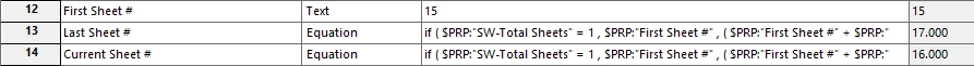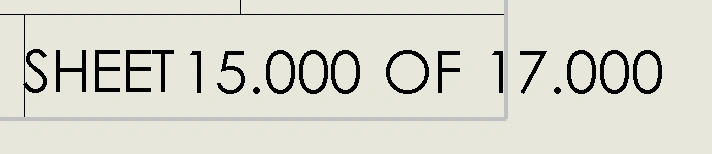 I thought I was clever, and tired to make a custom property and use the equations to take this initial offset of the sheets and calculate the sheets current number and the final number based on the starting point of the first sheet. The equation worked! But the only problem is it spits out the sheet number with 3 sig figs. So when I use the text box to call from these custom properties, it will show up in three sig figs. Like "SHEET 15.000 OF 17.000"