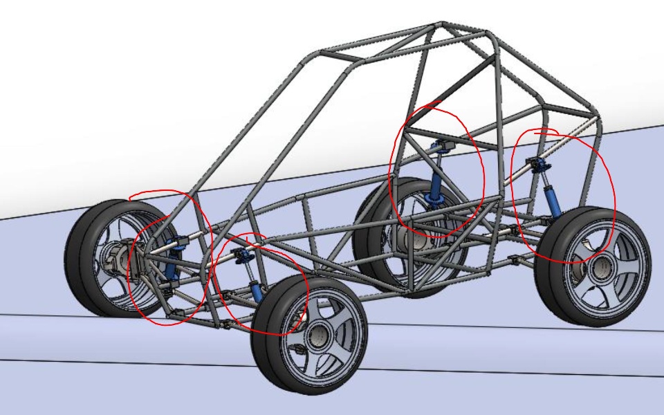 I want to do a motion study, with a car that has to drive over a roadbumper. But to do the study, i would like to replace the 4 encircled shock aborbers with springs and dampers, as the car just collapses with the dampers only.