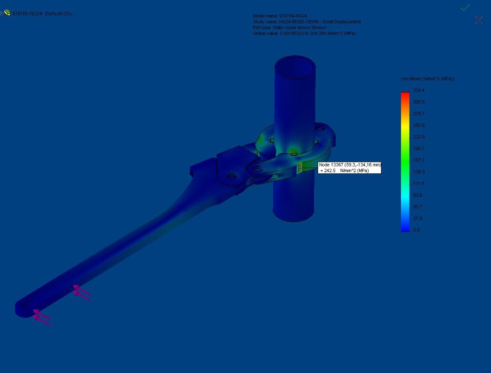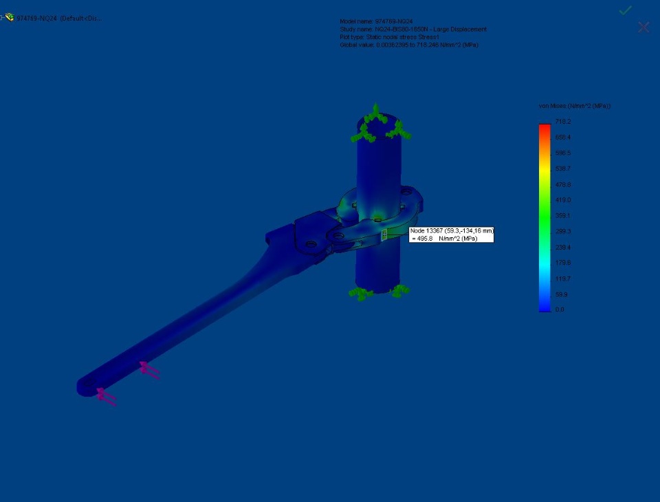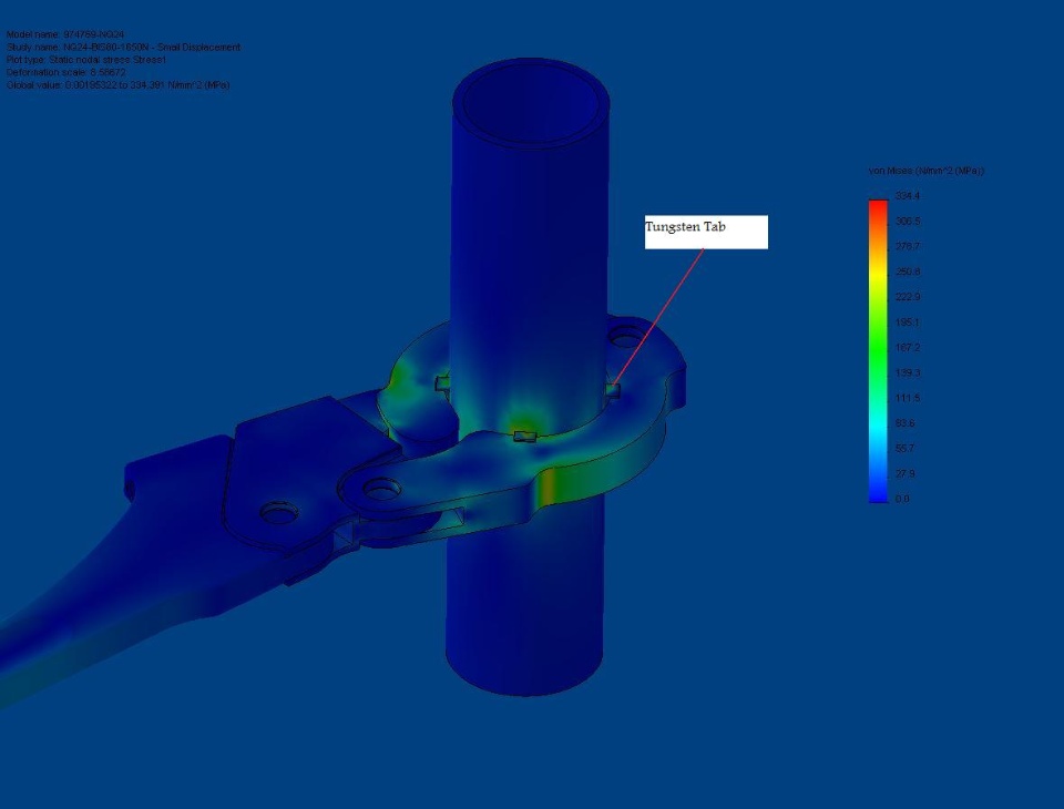 I have a model of a solid grip wrench. I have ran two separate studies on this model. One with small displacement and the other with large displacement flag on. The difference between resultant Von-mises stresses and also displacements are significant (almost 2:1). I couldn't figure out what the reason is. I would appreciate if someone can give me some advice. I have attached a few images of the wrench assembly. I had two simplify the Tungsten tab on the jaws and I have defined a bonded contact set between the tabs and the pipe.