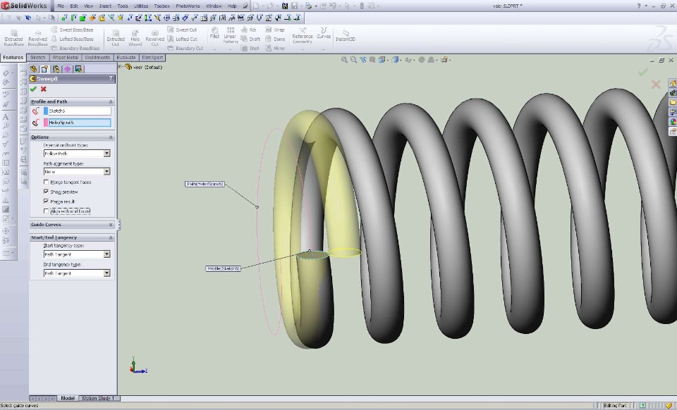 I try to create a sweep using a helix. In the attached picture you can see the helix-path is revolving in the correct direction but when use it to make a sweep, the sweep is reversed. Any ideas how i can fix it so the sweep will create in the correct direction???SolidworksParts And Features