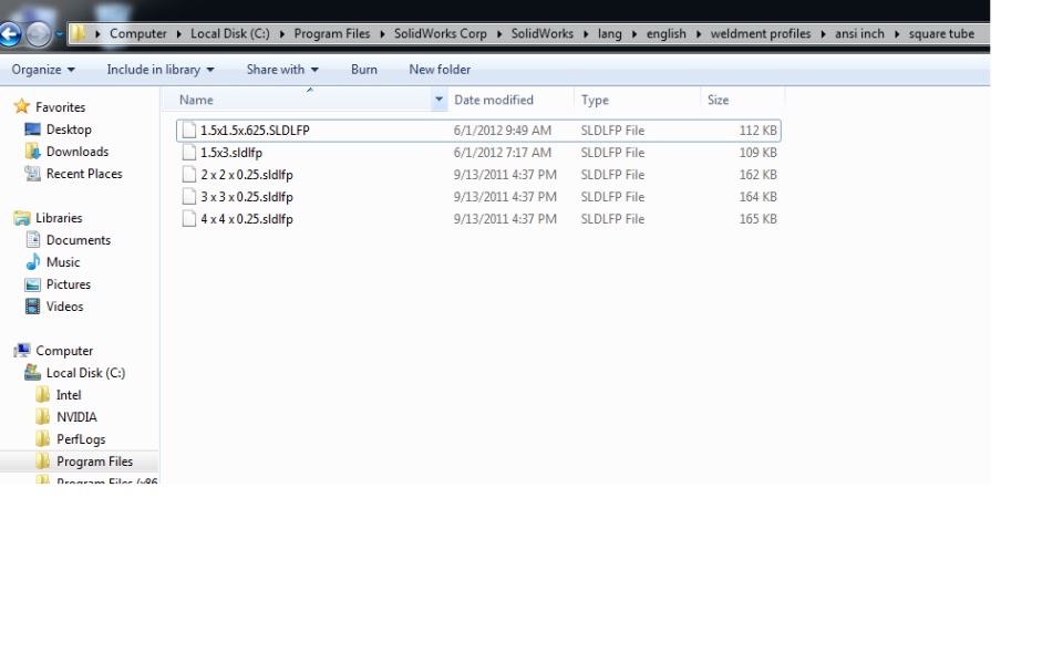 So i'm trying to create a custom weldment. I have it finished but for some odd reason when I go to save it as a .sldlfp and it tells me that it was unable to save because I do not have permission. So I figured I would have to right click on SW and run as administrator, but the command is not there. I'am trying to save the weldment to its own folder built into the weldments folder. I would assume that there is a way to get around this. I'm running SW 2012 prem. I must be doing something wrong in my process of saving. Should I just add a file path to it? My file path for my weldments is C: Program files/Solidworks Corp/ lang/ english/ weldment profiles/ansi inch. I looked into other posts on adding custom weldments but none that I noticed had problems saving.