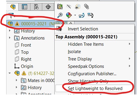 This new forum is requiring more effort than I care to give in regards to finding anything so I have no idea if I'm posting this in the correct spot. Anywho, I'm looking for a way to set Lightweight to Resolved for an entire assembly using a macro. In the past, I've found several posts about setting each individual component to lightweight, or resolved, but that's not exactly what I'm looking for. In the pic attached here, I show an option that displays when you right click on the file name at the top of the feature manager, which is the open assembly. There's an option called "Set Lightweight to Resolved". This option then sets all sub-components in that assembly to resolved. I'm looking for a way to do this with a macro. Any help would be appreciated.